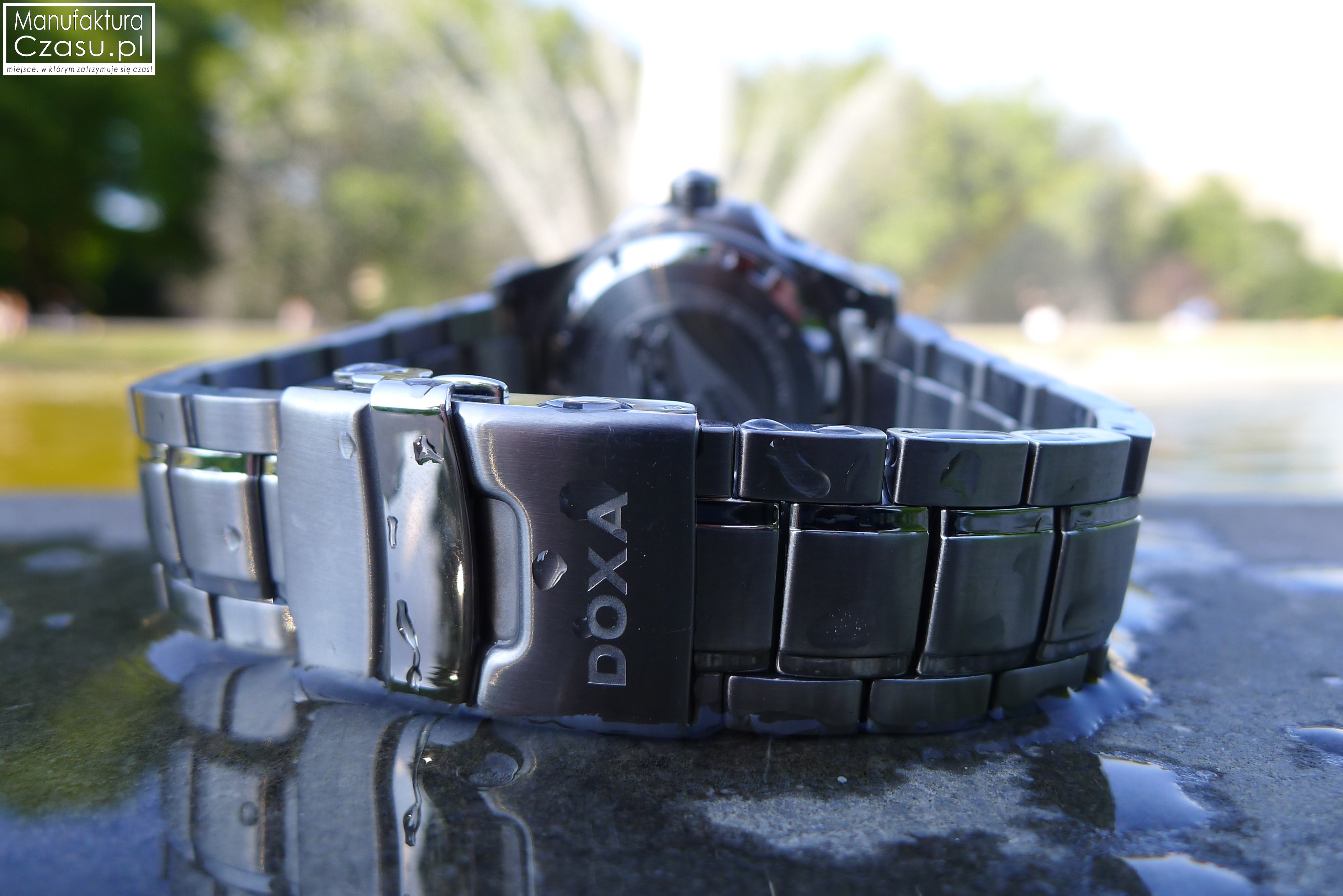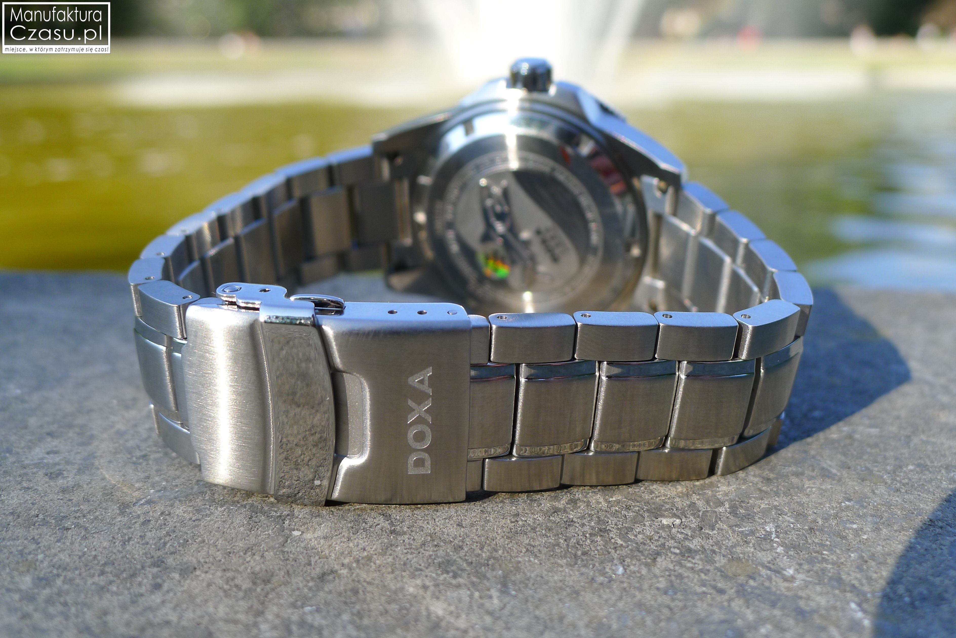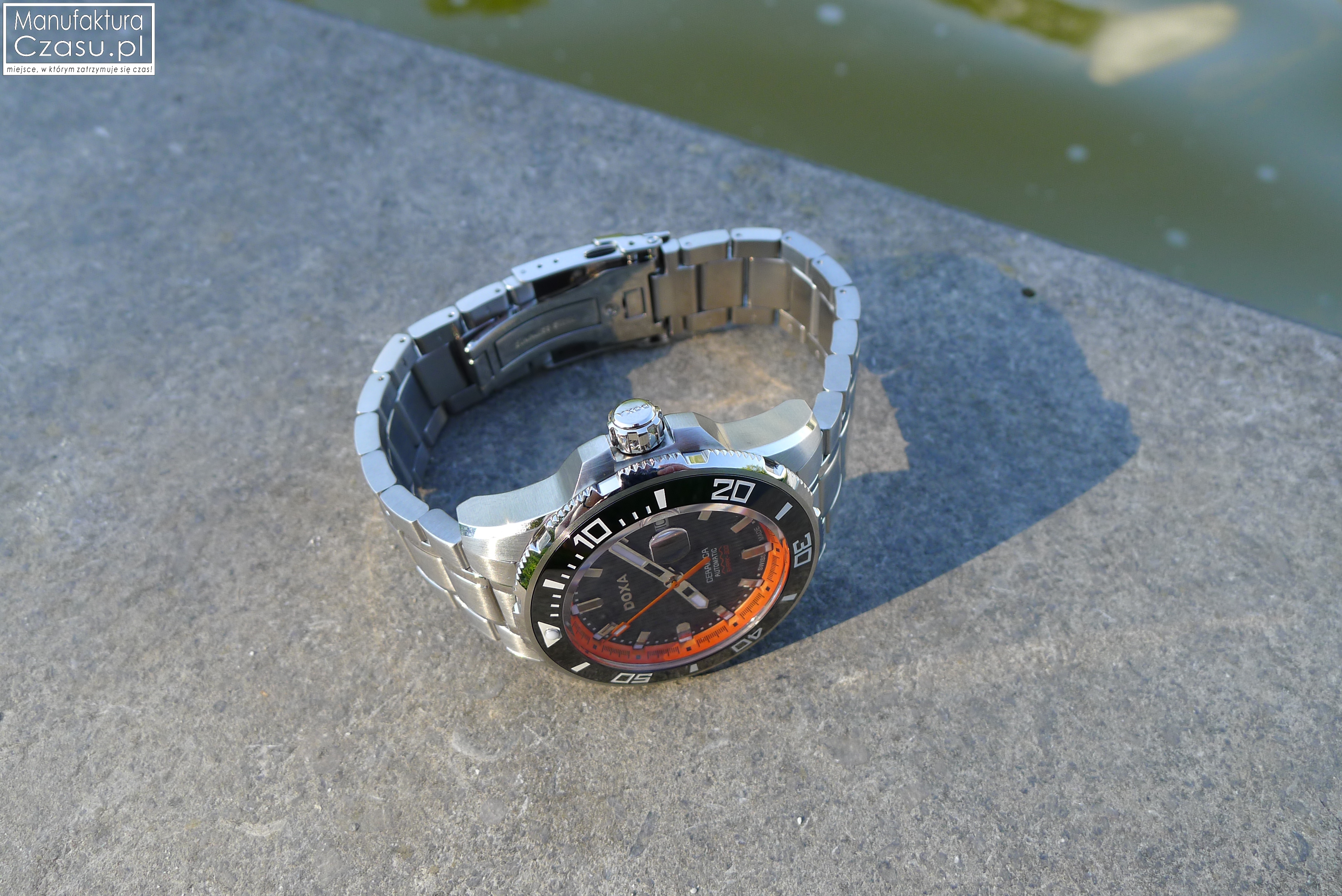 Całość dopełnia zakręcana, stalowa koronka z wyraźnym logo Doxa, która również dzięki większym niż zwykle rozmiarom jest bardzo wygodna w codziennej obsłudze. Koronka czasomierza jest zakręcana, co ma oczywiście związek z jego podwyższonymi właściwościami ochronnymi, umożliwiającymi wykorzystywanie zegarka pod wodą do głębokości 300 m / 984 f / 30 ATM.