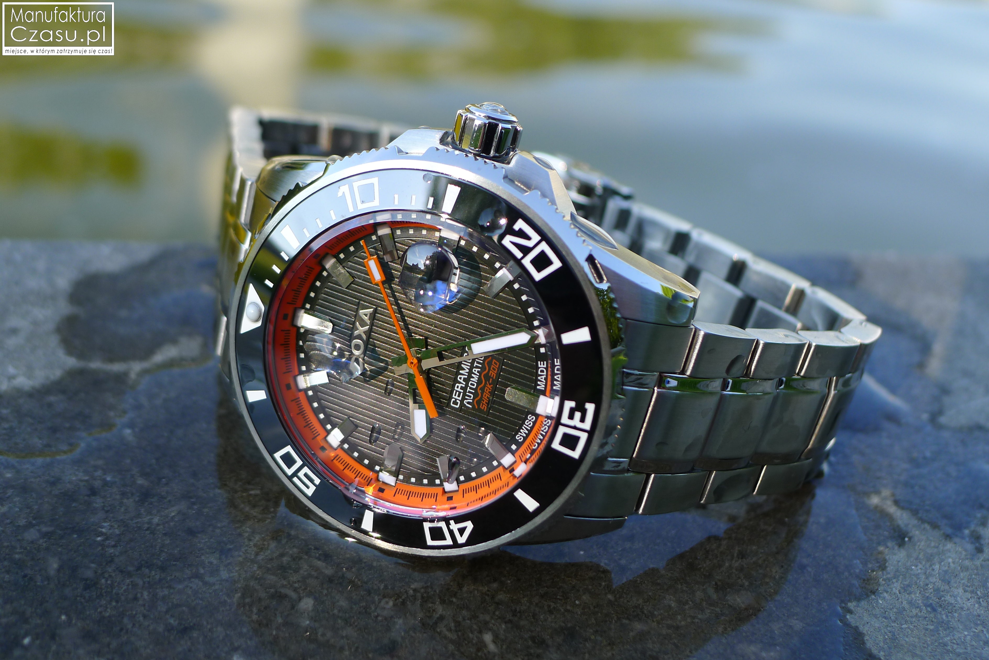 Zegarek posiada obrotowy, ceramiczny bezel oraz komplikację w postaci prezentacji daty. Jak wspominałem wcześniej, nie jest to model wielce skomplikowany, a pracuje w nim doskonale znany i niezawodny kaliber ETA 2824-2. Niemniej jego siła tkwi w wykończeniu każdego detalu, w widocznej precyzji wykonania i dbałości o najmniejsze szczegóły oraz, a może przede wszystkim, w bardzo wysokich parametrach wytrzymałości, gdyż zegarek posiada klasę wodoszczelności do poziomu 300 metrów, czyli wytrzymuje ciśnienie 30 bar.