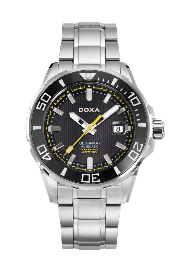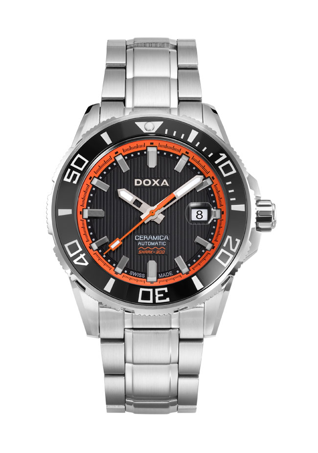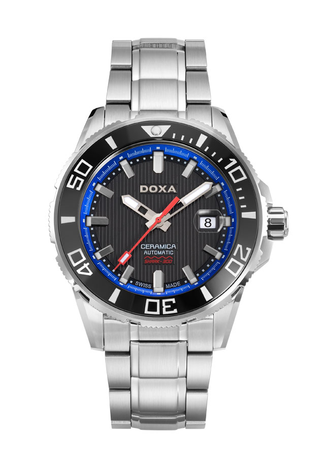 W górnej części tarczy znajduje się logo DOXA, a w dolnej części tarczy, na wypukłej tabliczce napisy: CERAMICA, AUTOMATIC i SHARK 300.